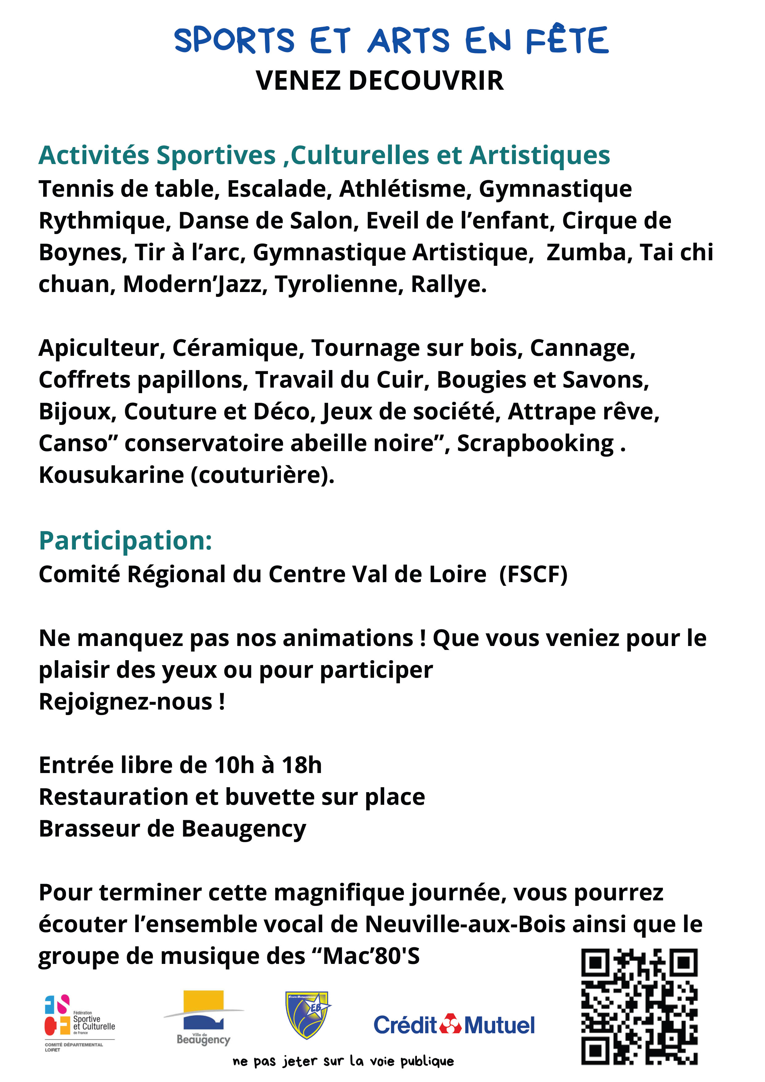 Entrée gratuite, restauration sur place, demonstration sportive, initiation, formation musicale, demonstration et vente de créations artisanales.